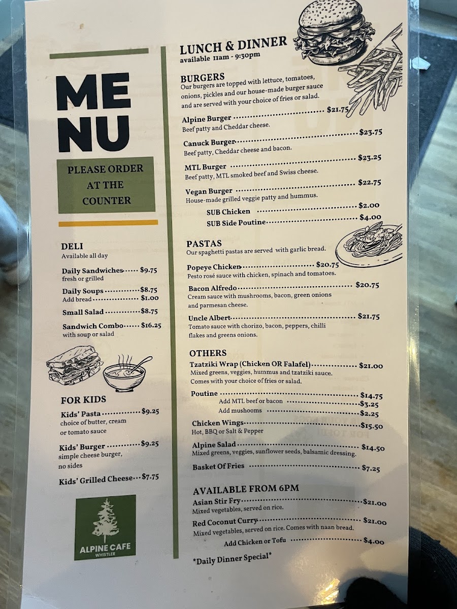 Alpine Cafe also caters to its younger patrons with a range of kid-friendly options like the Kids' Pasta and Kids' Burger, each priced under CA$10, ensuring a delightful experience for the whole family. And if you're in the mood for something refreshing, their smoothie selection—including the Green Beginnings and Chocolate Maca—is not just a treat for the taste buds but also a healthy choice.